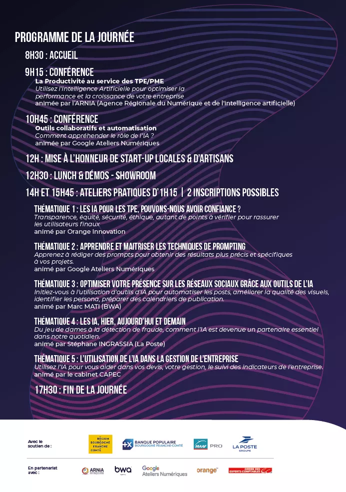 La CMA Bourgogne Franche-Comté vous invite à l'IA Day Pro, une journée exceptionnelle dédiée à l'intelligence artificielle et à ses applications pour les artisans, TPE et PME de notre région.